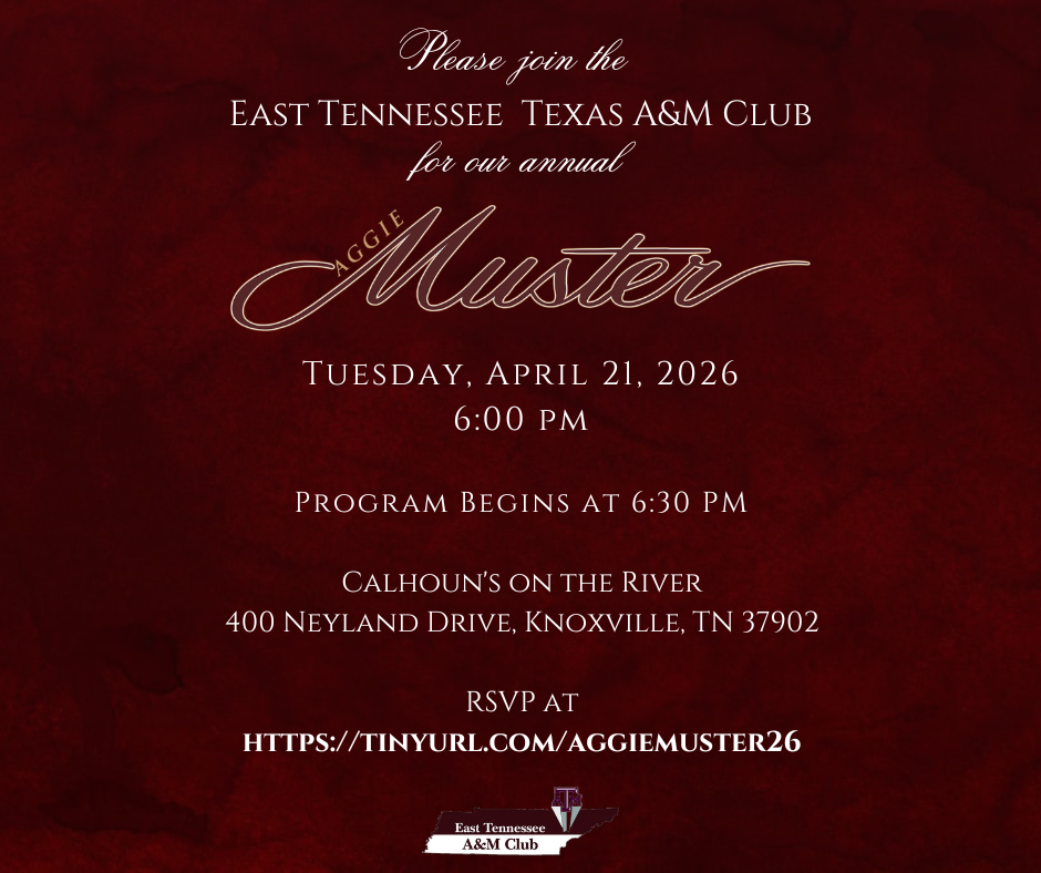 Over 80 Ags and guests attended and I estimated that about 20 attended the East Tennessee Aggie Club Muster for the first time. A special thanks to Fred Seals for the invocation and to Gerry Meisner for reading the Roll Call. Our club founder, Keith Hairell, could not attend because he was recovering from an appendectomy but he was with us in spirit. That was the first Muster he has missed in 23 years!